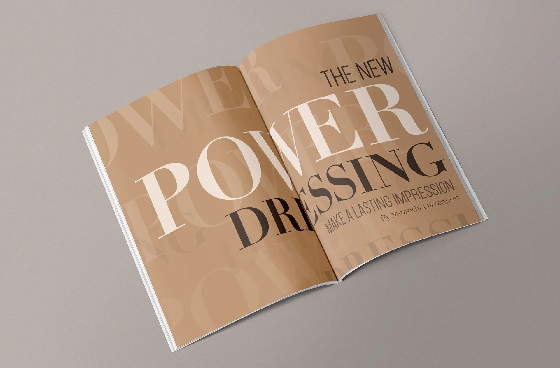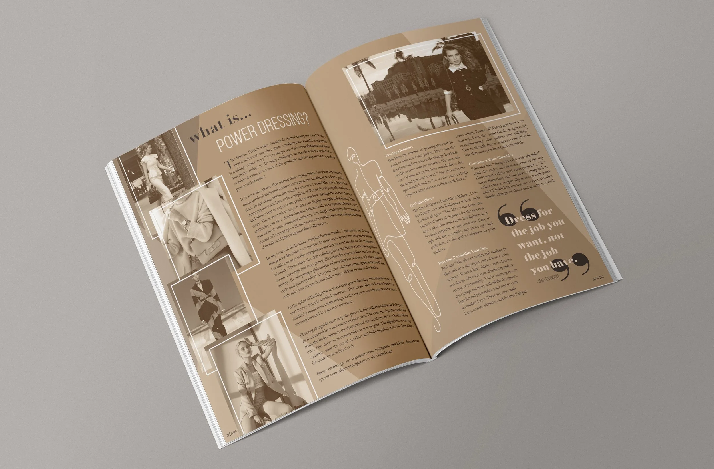 Participating in SPD Design contest, I created a two page editorial spread centered around the theme Power Dressing. Using a rich monochromatic brown color palette, I embraced a a trendy and timeless aesthetic that reflects confidence and sophistication. I combined strong typography, balanced layout and custom illustrations to create a cohesive, fashion focused design that communicates empowerment in clothing and modern style.